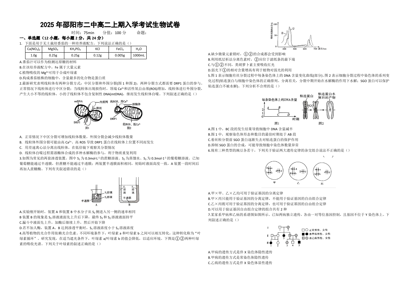 高三生物--湖南省邵阳市第二中学2025-2026学年高二上学期入学考试