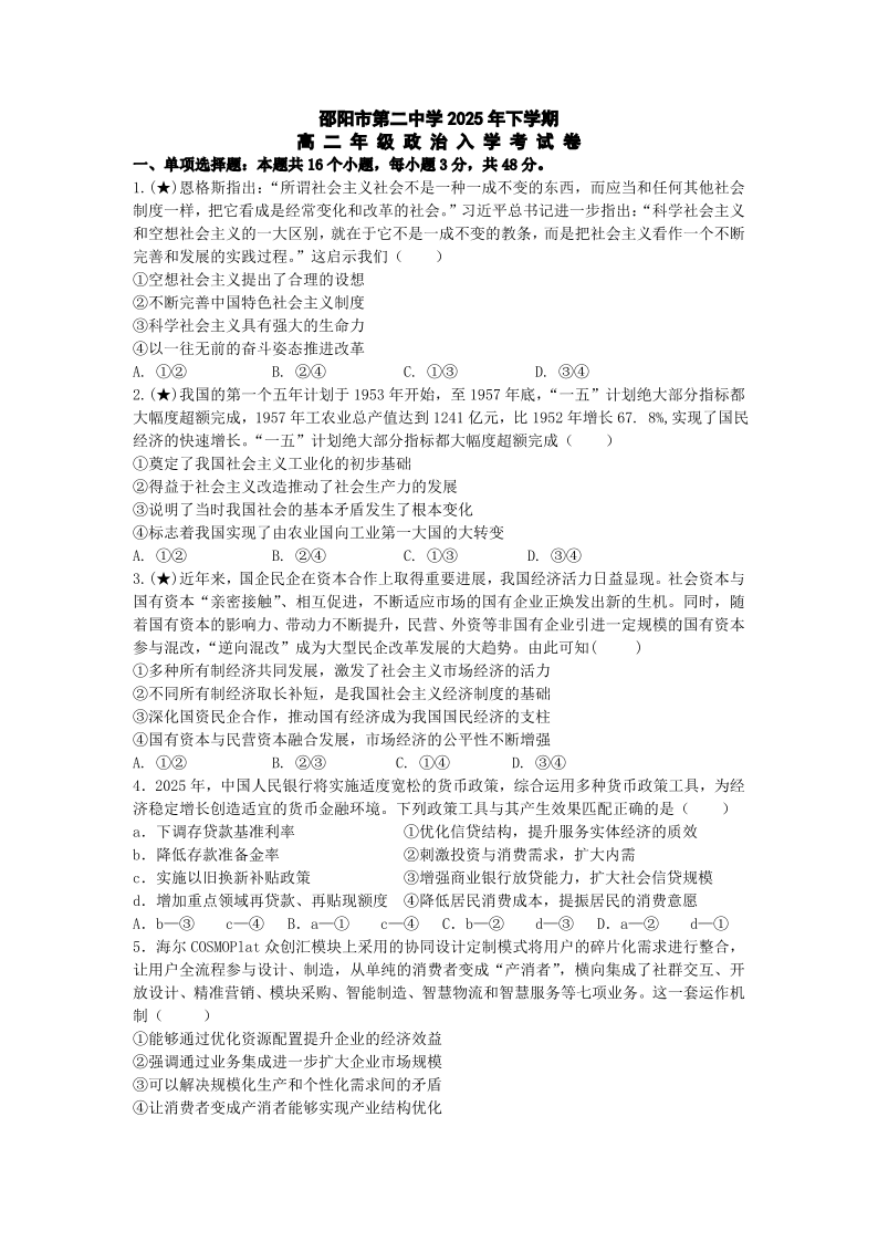 高三政治--湖南省邵阳市第二中学2025-2026学年高二上学期入学考试
