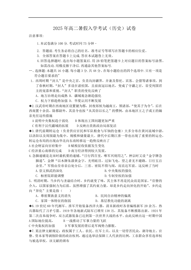 高三历史--湖南省邵阳市第二中学2025-2026学年高二上学期入学考试