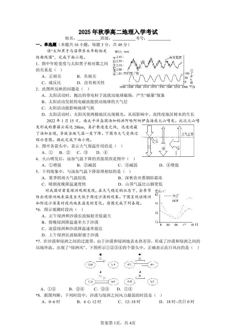 高三地理--湖南省邵阳市第二中学2025-2026学年高二上学期入学考试