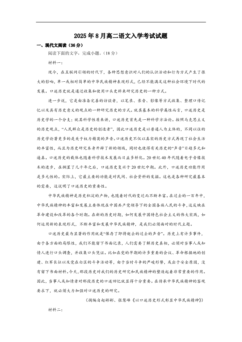 高二语文+答案--湖南省岳阳市汨罗市第一中学2025-2026学年高二上学期8月开学考试