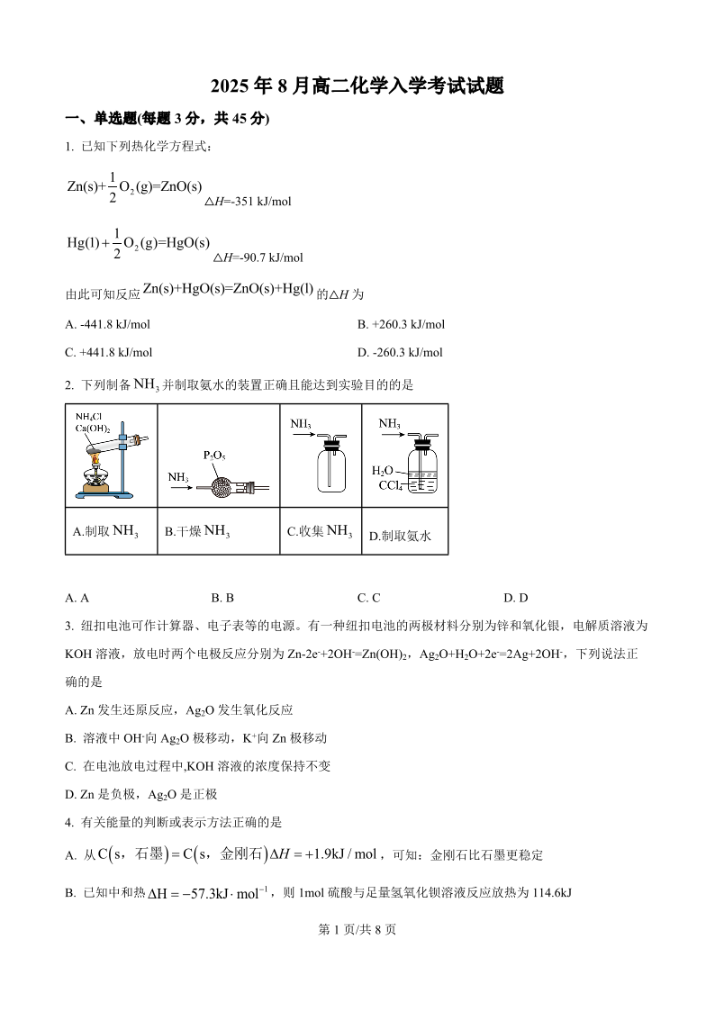 高二化学(原卷版)--湖南省岳阳市汨罗市第一中学2025-2026学年高二上学期8月开学考试