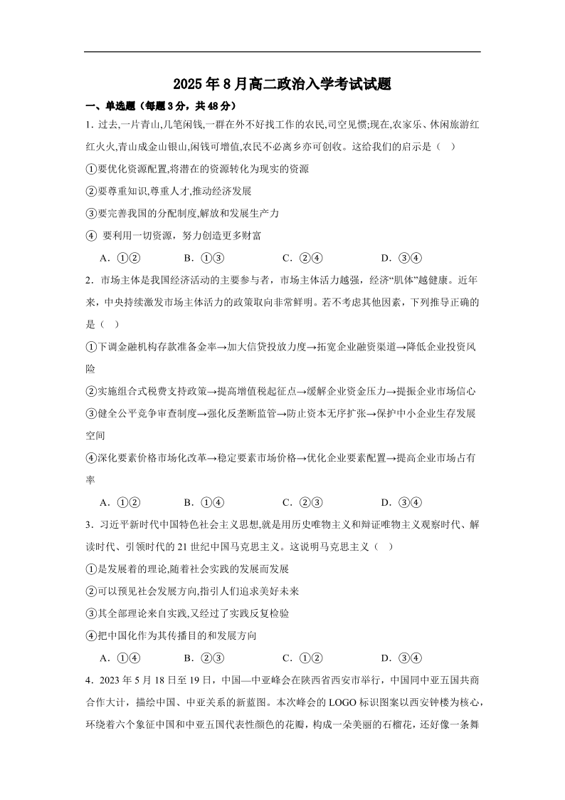 高二政治+答案--湖南省岳阳市汨罗市第一中学2025-2026学年高二上学期8月开学考试