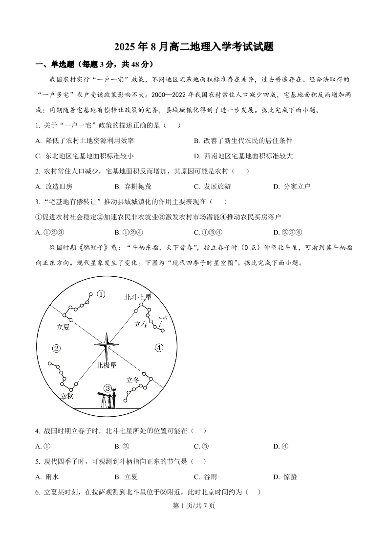 高二地理(原卷版)--湖南省岳阳市汨罗市第一中学2025-2026学年高二上学期8月开学考试