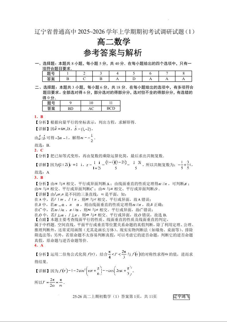 高二数学(1)答案--辽宁省普通高中2025-2026学年高二上学期期初开学考试