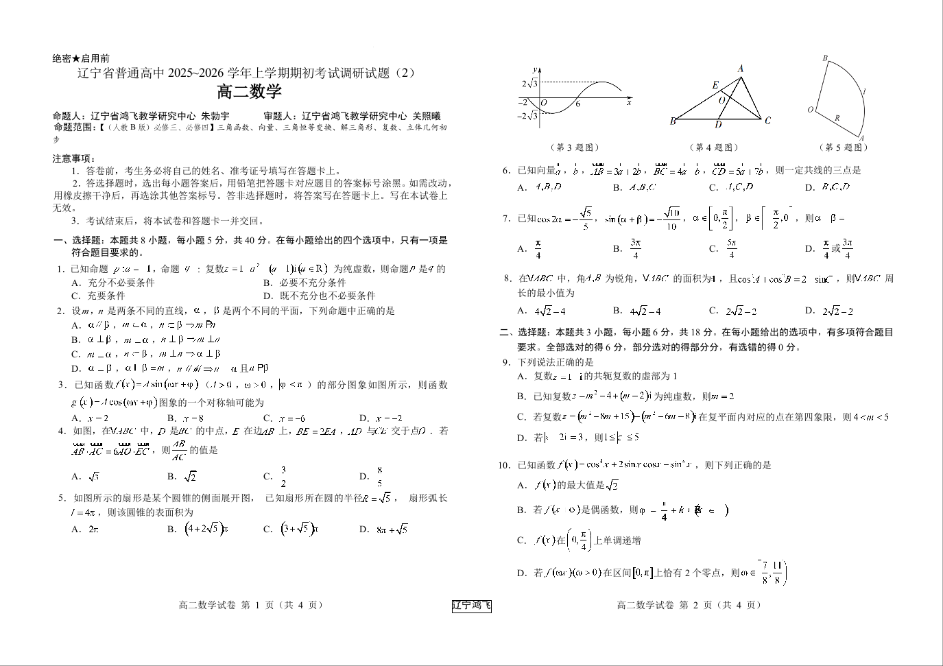 高二数学(2)--辽宁省普通高中2025-2026学年高二上学期期初开学考试