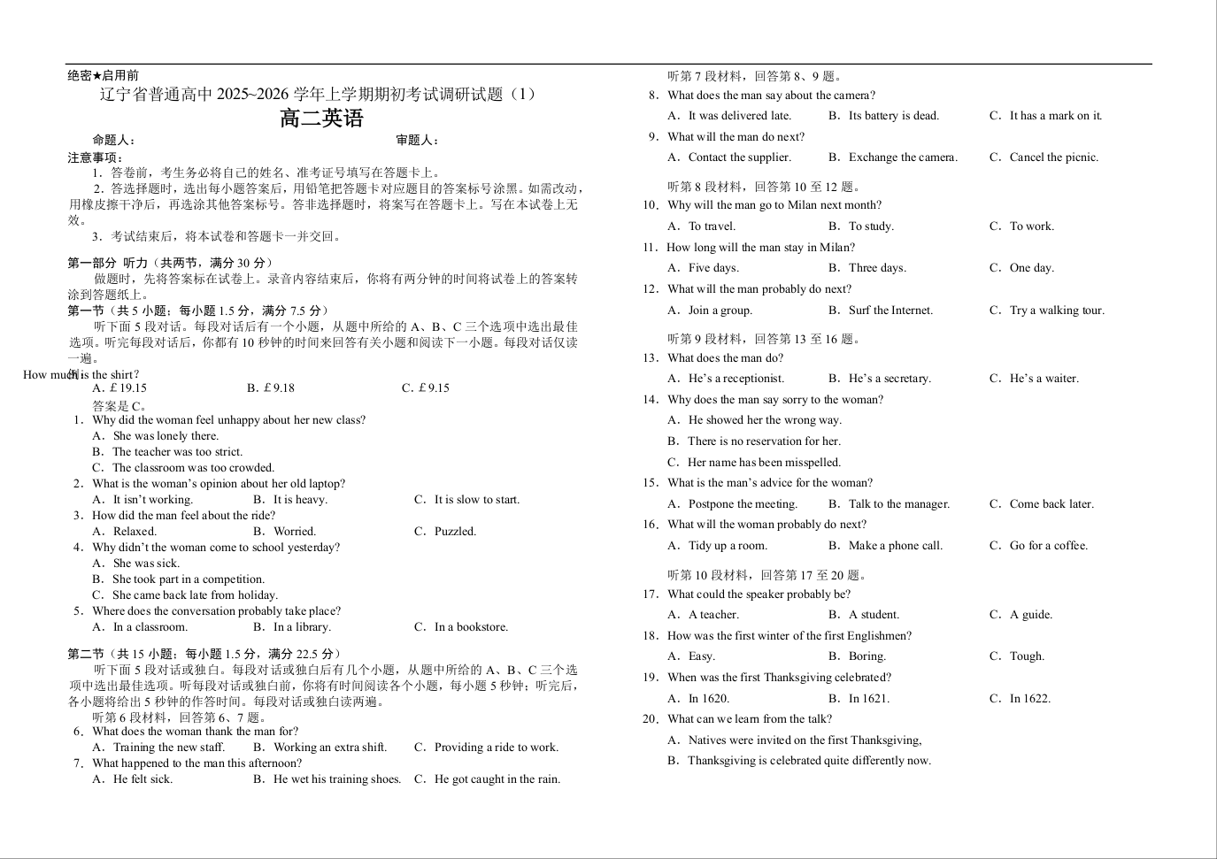 高二英语(1)--辽宁省普通高中2025-2026学年高二上学期期初开学考试