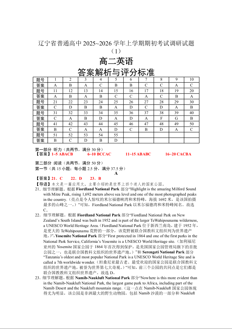 高二英语(1)答案--辽宁省普通高中2025-2026学年高二上学期期初开学考试