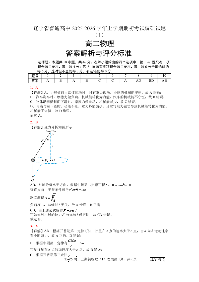 高二物理(1)答案--辽宁省普通高中2025-2026学年高二上学期期初开学考试
