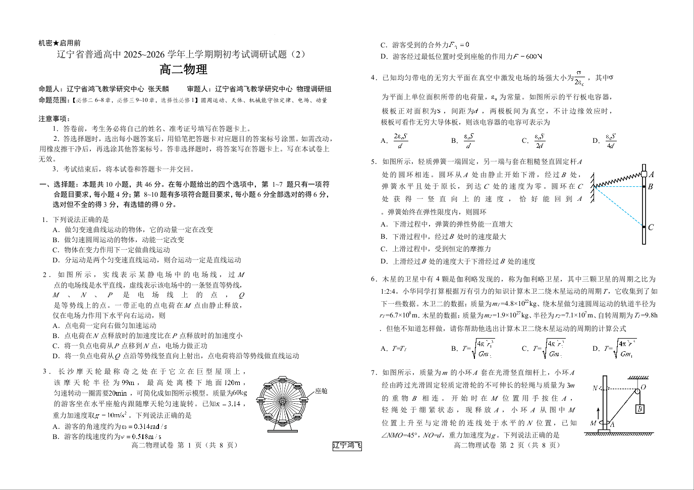 高二物理(2)--辽宁省普通高中2025-2026学年高二上学期期初开学考试