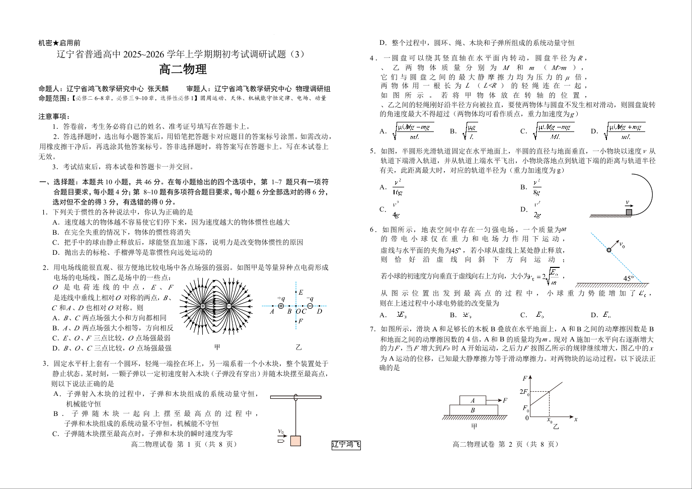 高二物理(3)--辽宁省普通高中2025-2026学年高二上学期期初开学考试