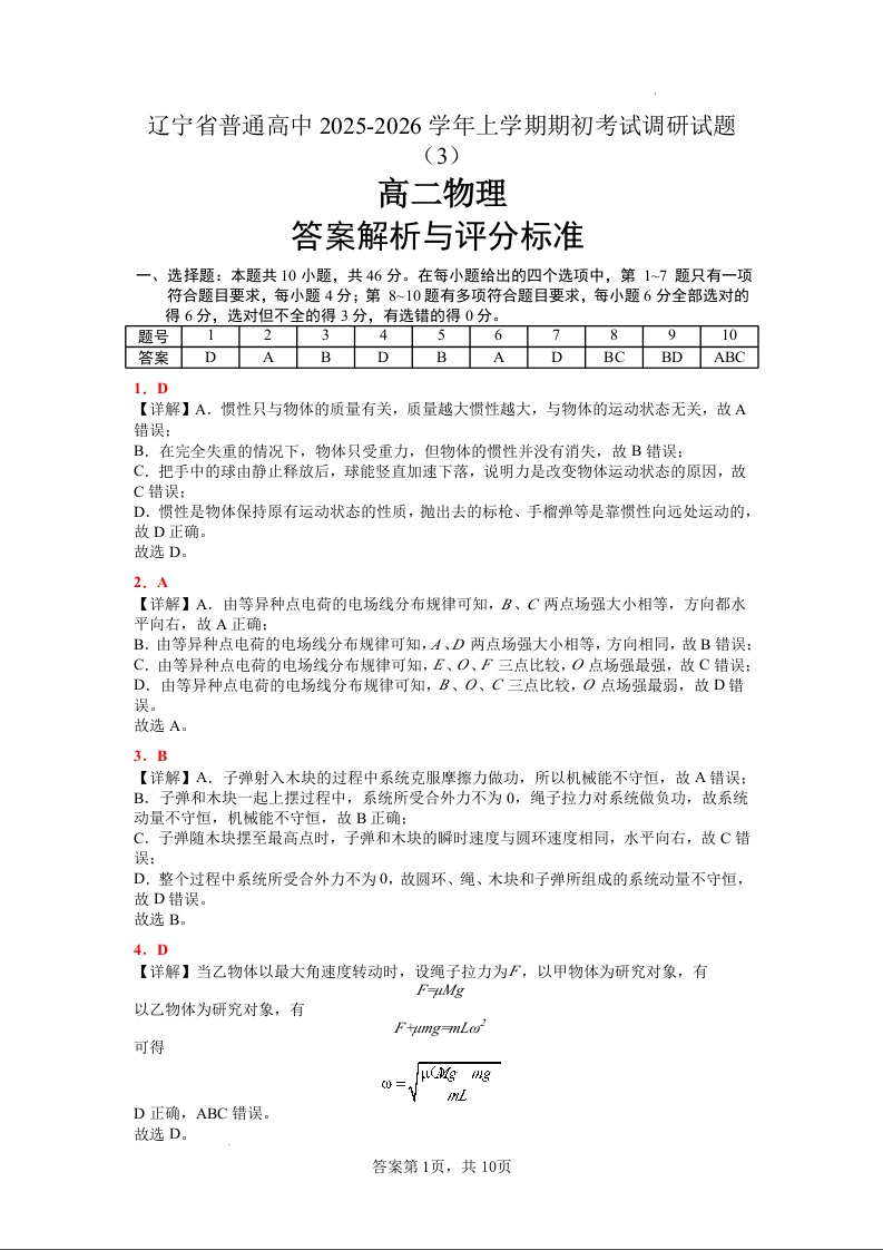 高二物理(3)答案--辽宁省普通高中2025-2026学年高二上学期期初开学考试