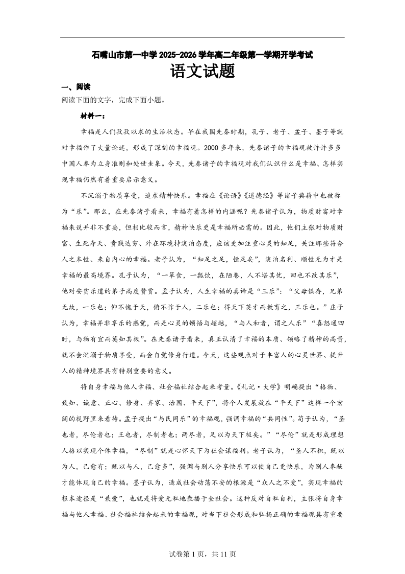 高二语文--宁夏石嘴山市第一中学2025-2026学年高二上学期开学考试试题