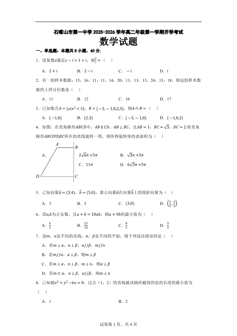 高二数学--宁夏石嘴山市第一中学2025-2026学年高二上学期开学考试试题