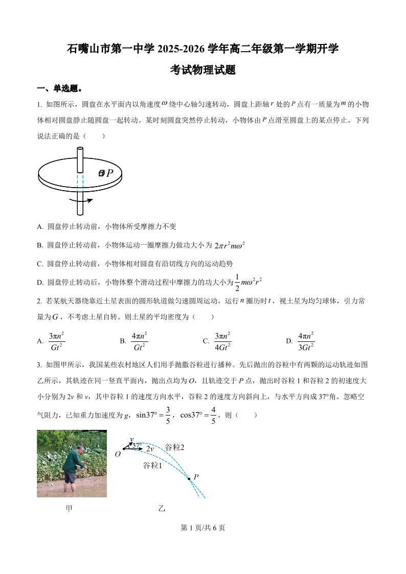 高二物理(原卷版)--宁夏石嘴山市第一中学2025-2026学年高二上学期开学考试试题