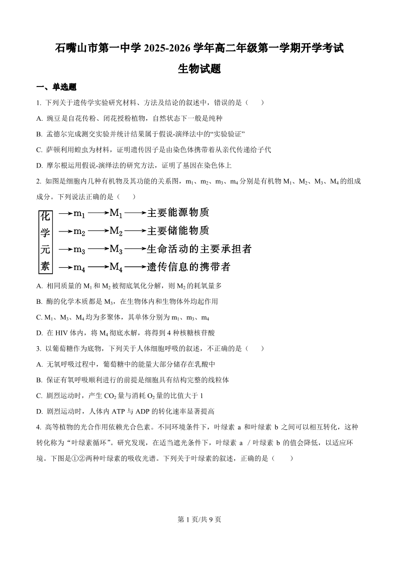 高二生物(原卷版)--宁夏石嘴山市第一中学2025-2026学年高二上学期开学考试试题