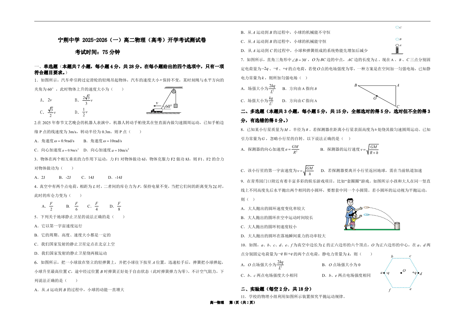 高二物理--宁夏吴忠市青铜峡市宁朔中学2025-2026学年高二上学期开学考试