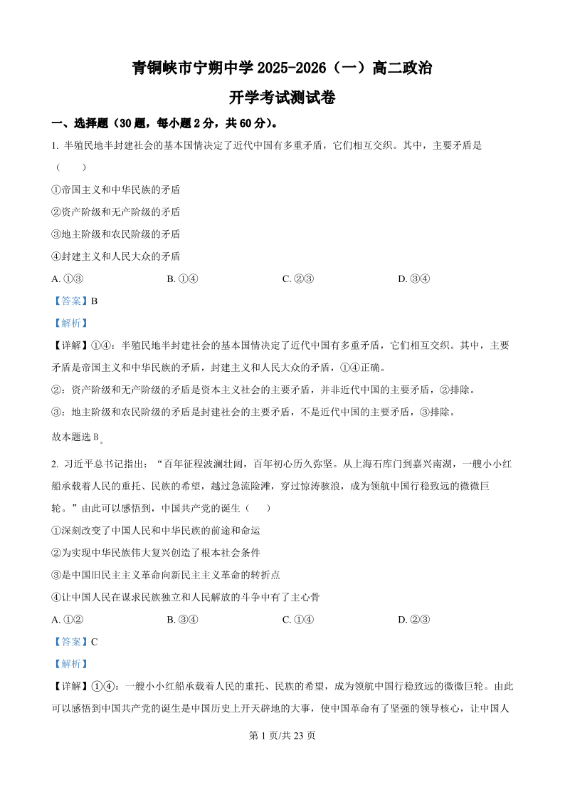 高二政治(精品解析版)--宁夏吴忠市青铜峡市宁朔中学2025-2026学年高二上学期开学考试