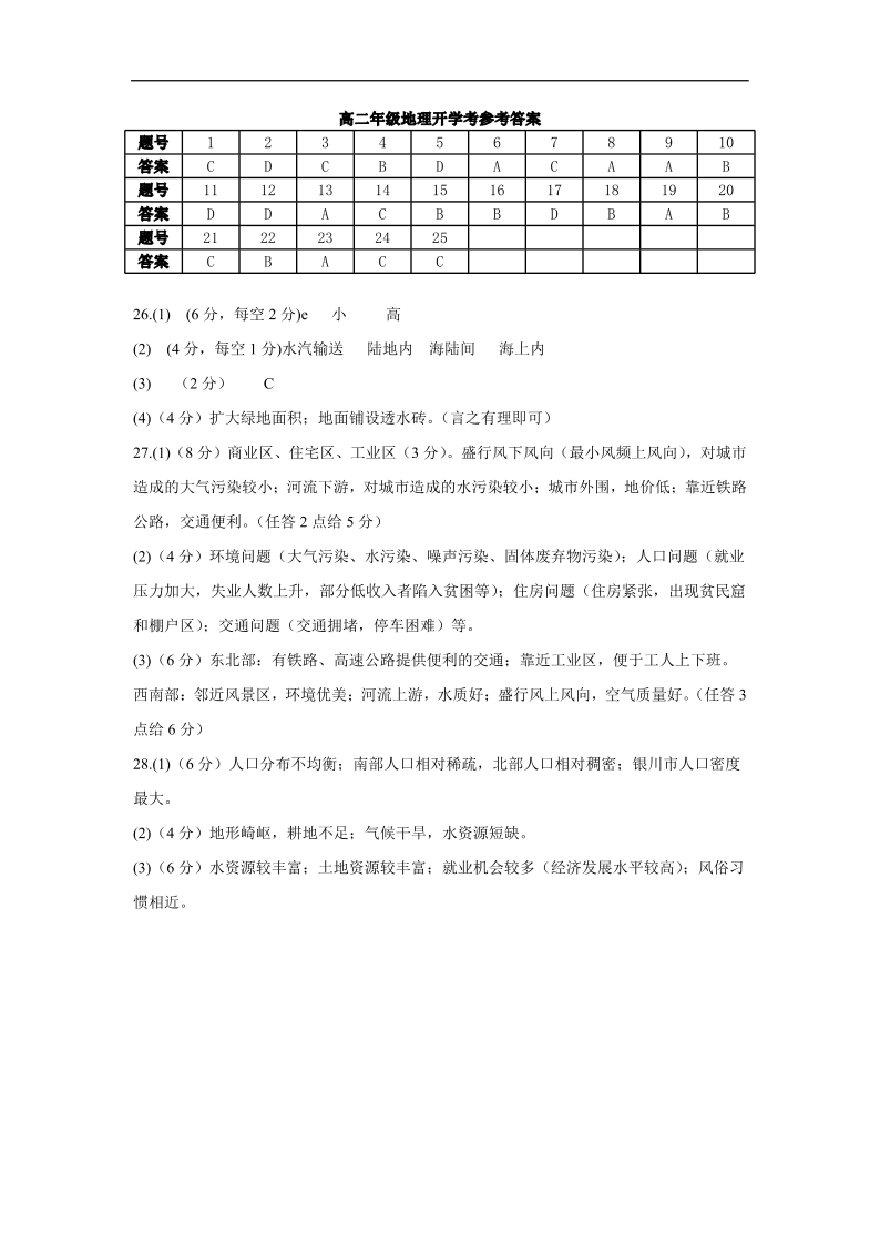 高二地理答案--宁夏吴忠市青铜峡市宁朔中学2025-2026学年高二上学期开学考试