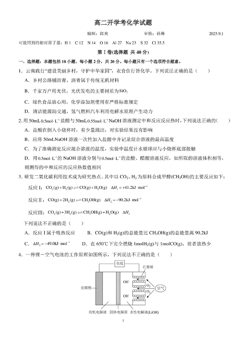 高二化学+答案--山东省德州市夏津第一中学2025-2026学年高二上学期开学考试