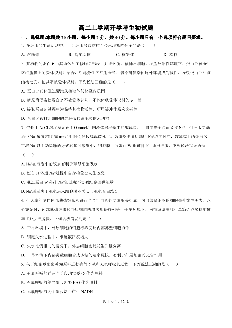 高二生物+答案--山东省德州市夏津第一中学2025-2026学年高二上学期开学考试