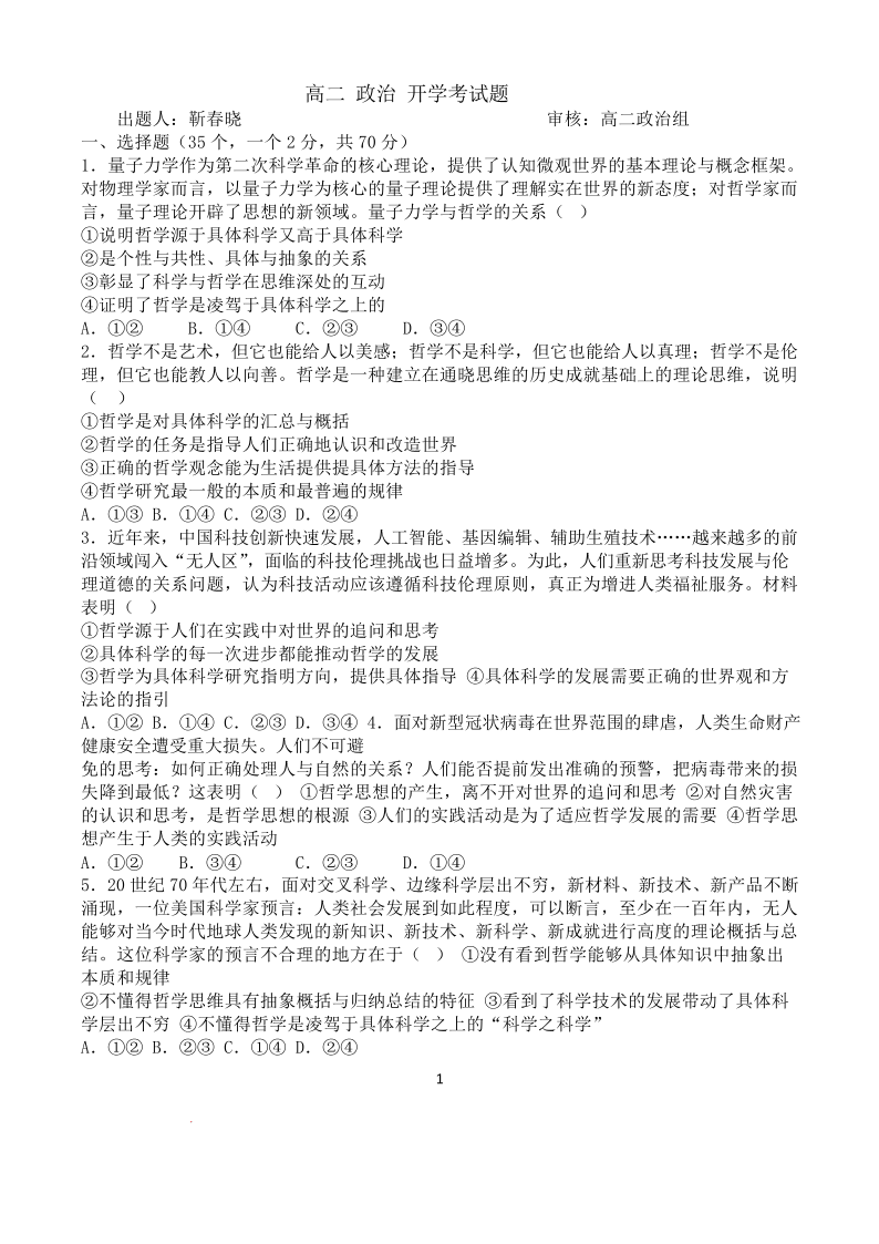 高二政治--山东省德州市夏津第一中学2025-2026学年高二上学期开学考试