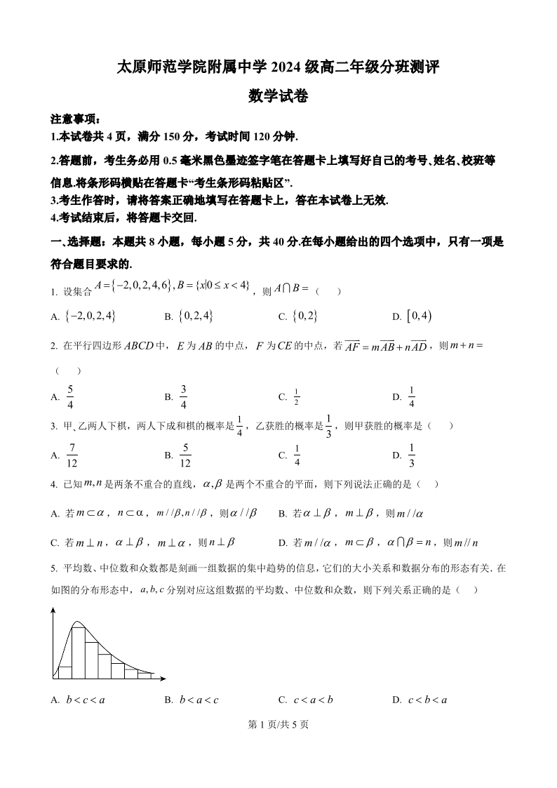 高二数学(原卷版)--山西省太原市太原师范学院附属中学2025-2026学年高二上学期开学分班测评