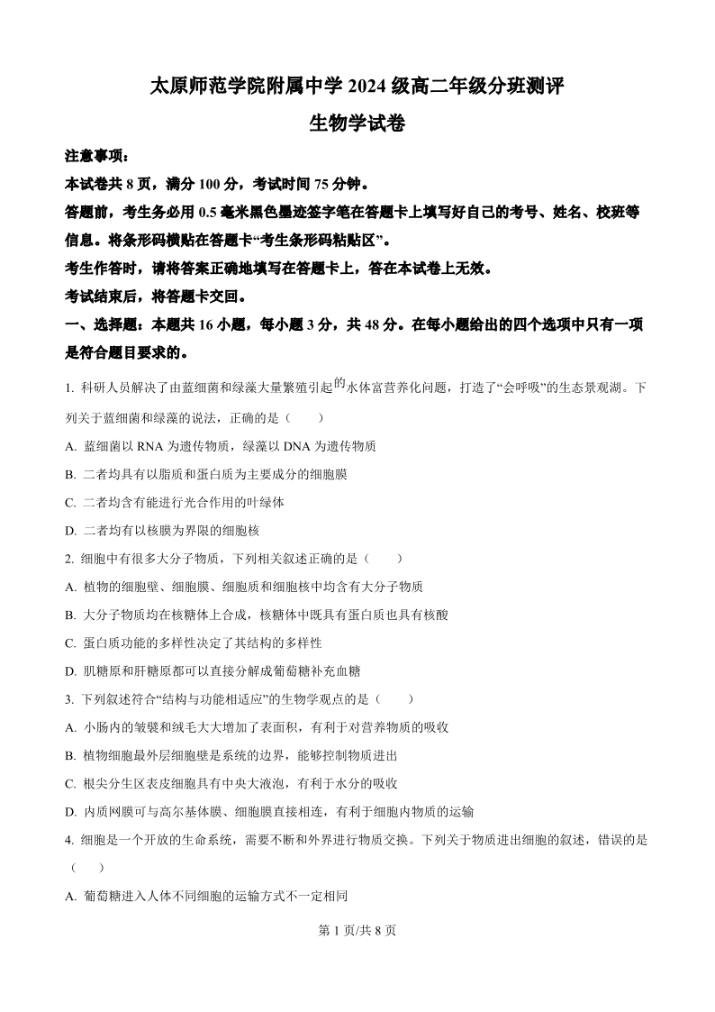高二生物(原卷版)--山西省太原市太原师范学院附属中学2025-2026学年高二上学期开学分班测评
