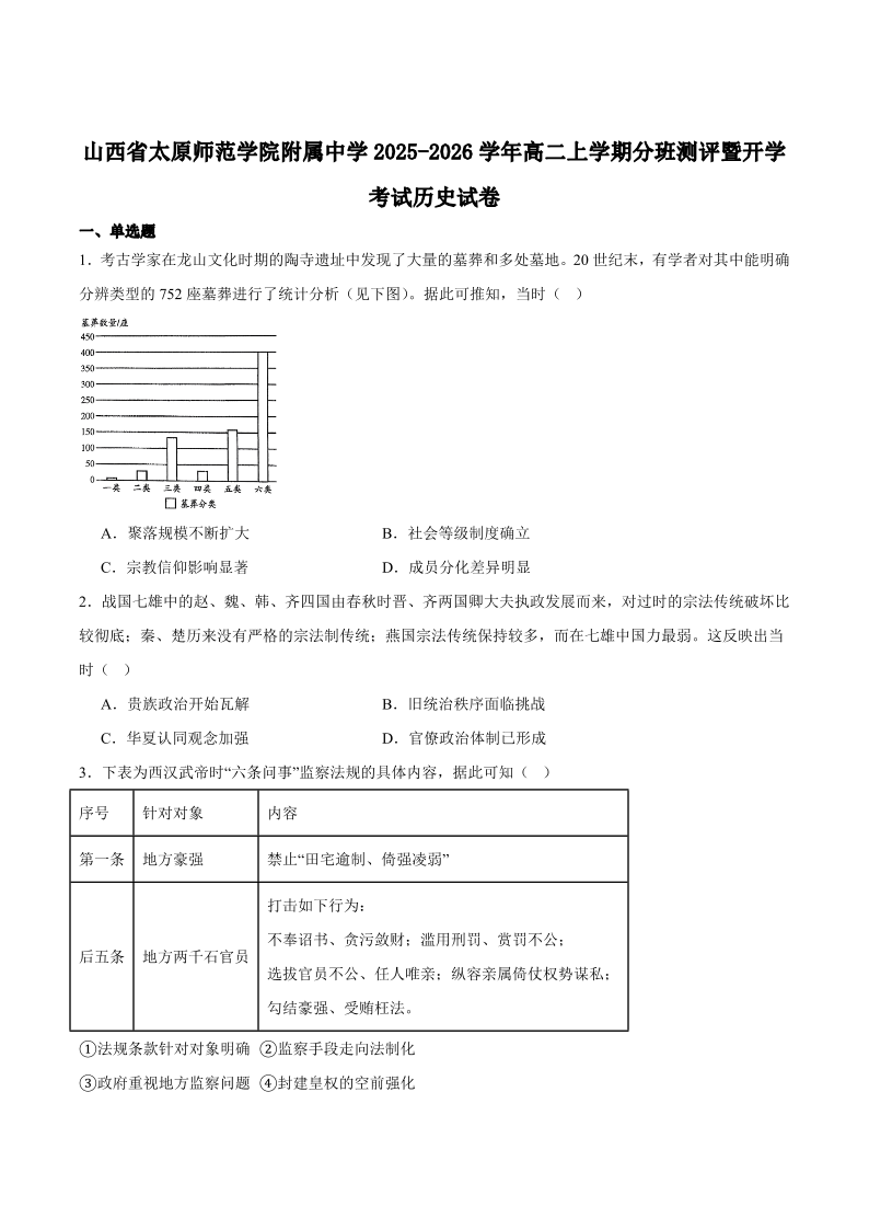 高二历史+答案--山西省太原市太原师范学院附属中学2025-2026学年高二上学期开学分班测评