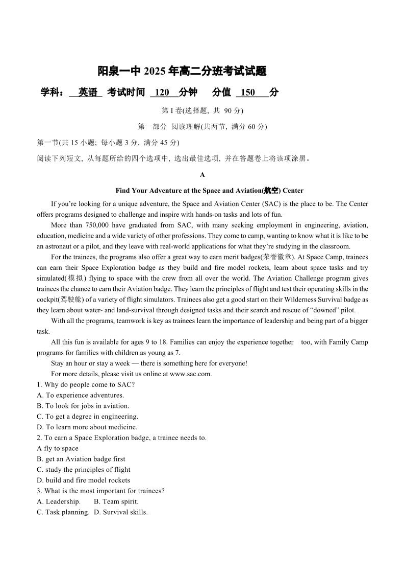高二英语+答案--山西省阳泉市第一中学校2025-2026学年高二上学期分班暨开学考试