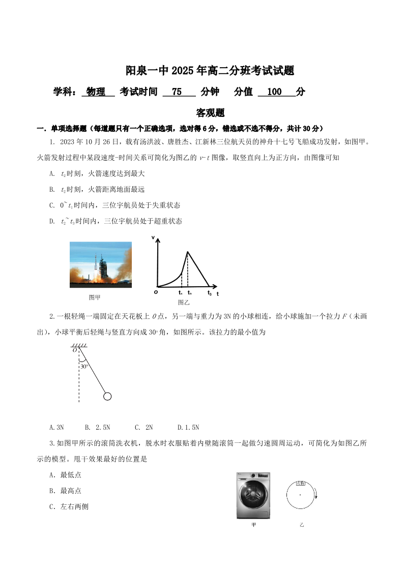 高二物理+答案--山西省阳泉市第一中学校2025-2026学年高二上学期分班暨开学考试