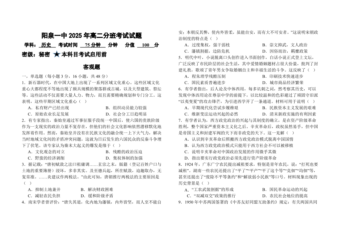 高二历史+答案--山西省阳泉市第一中学校2025-2026学年高二上学期分班暨开学考试