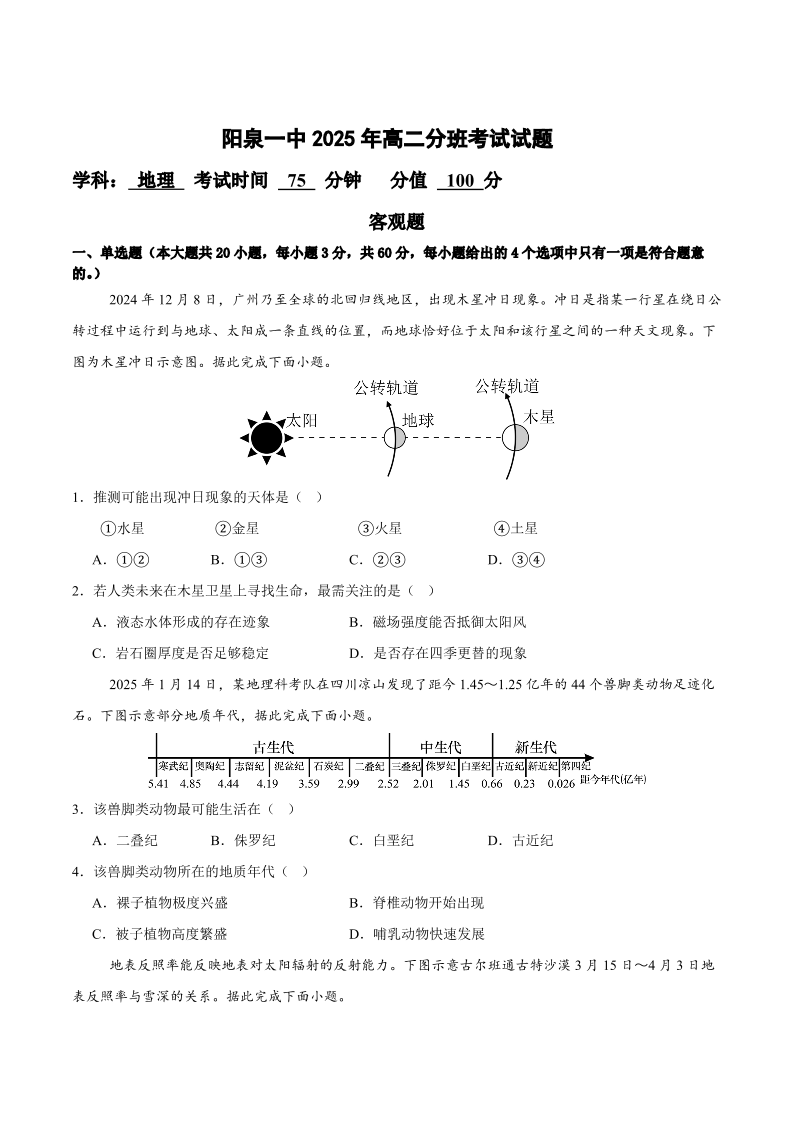 高二地理+答案--山西省阳泉市第一中学校2025-2026学年高二上学期分班暨开学考试