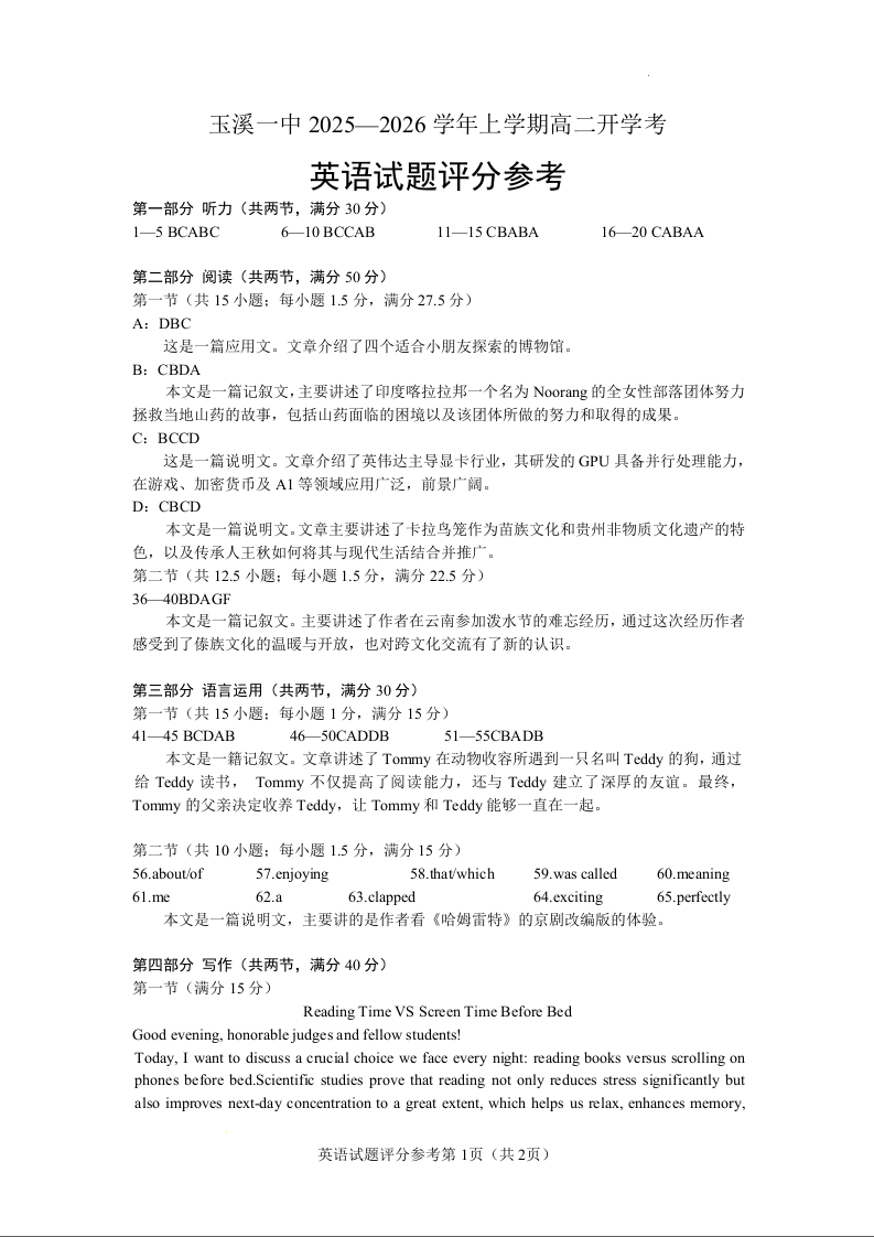高二英语答案--云南省玉溪第一中学2025-2026学年高二上学期开学考试