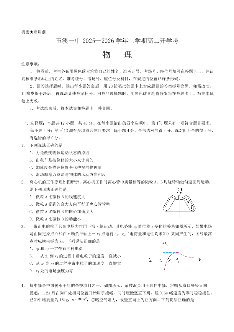 高二物理+答案--云南省玉溪第一中学2025-2026学年高二上学期开学考试