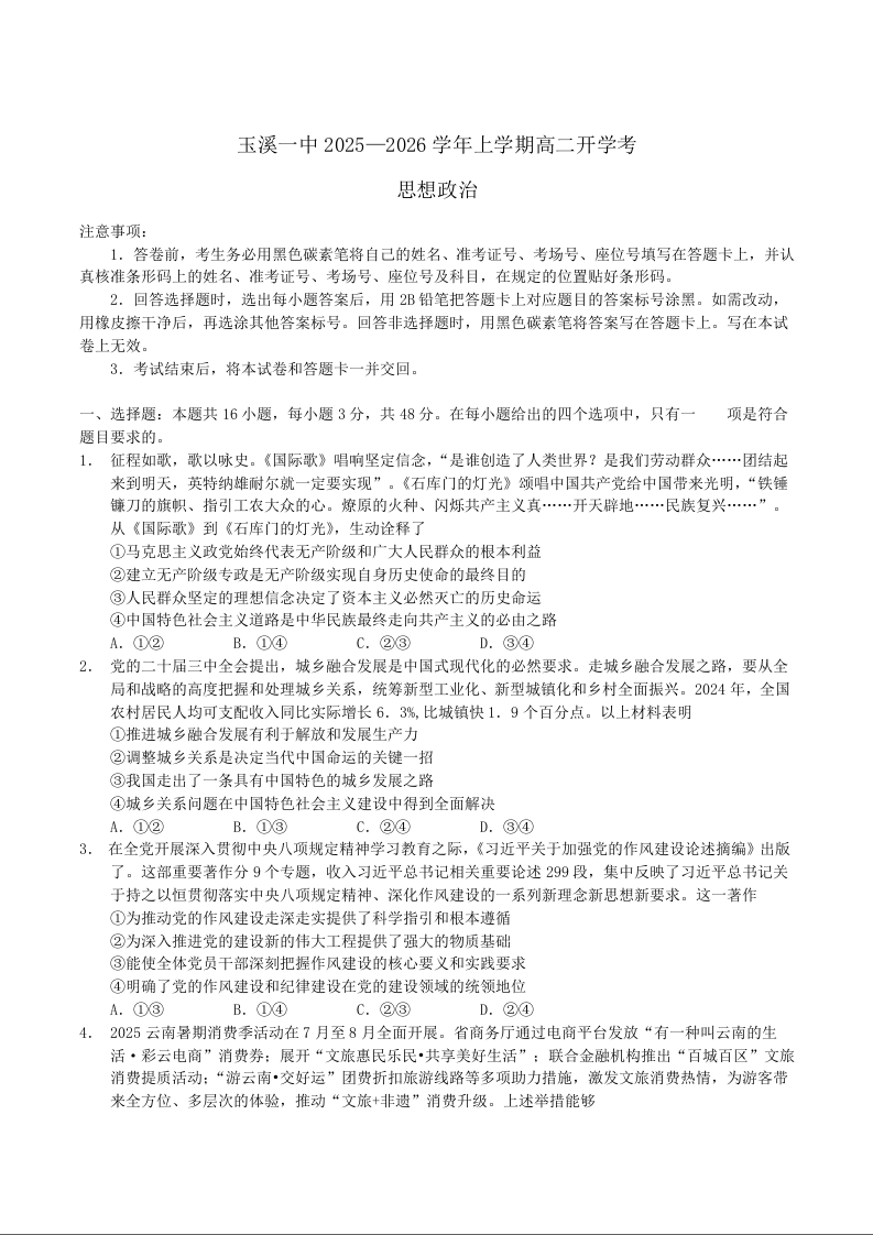 高二政治+答案--云南省玉溪第一中学2025-2026学年高二上学期开学考试
