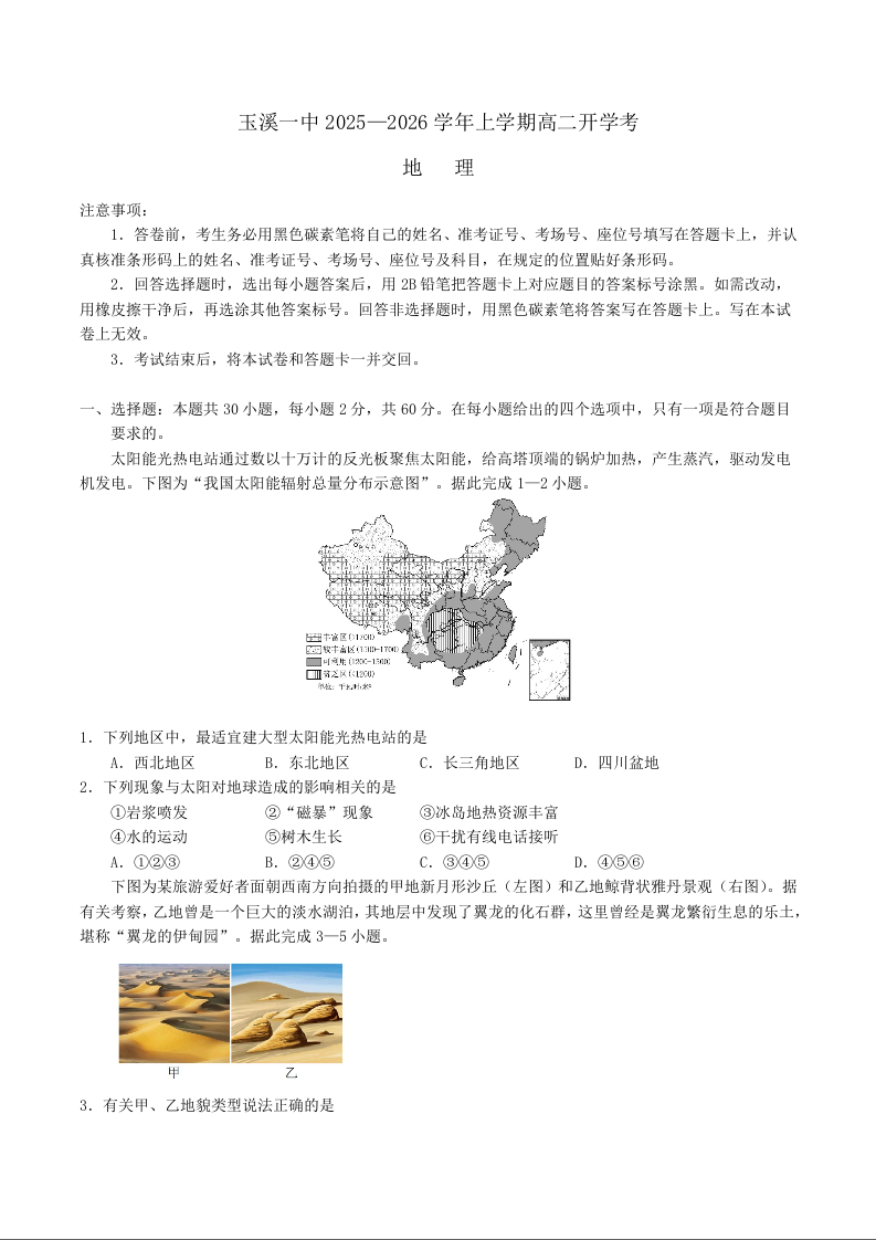 高二地理+答案--云南省玉溪第一中学2025-2026学年高二上学期开学考试