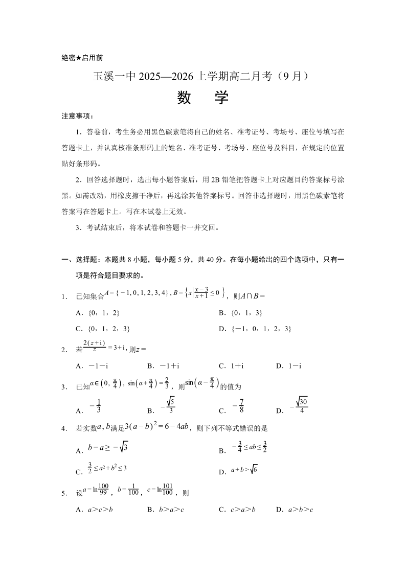 高二数学--云南省玉溪市红塔区玉溪第一中学2025-2026学年高二上学期9月月考