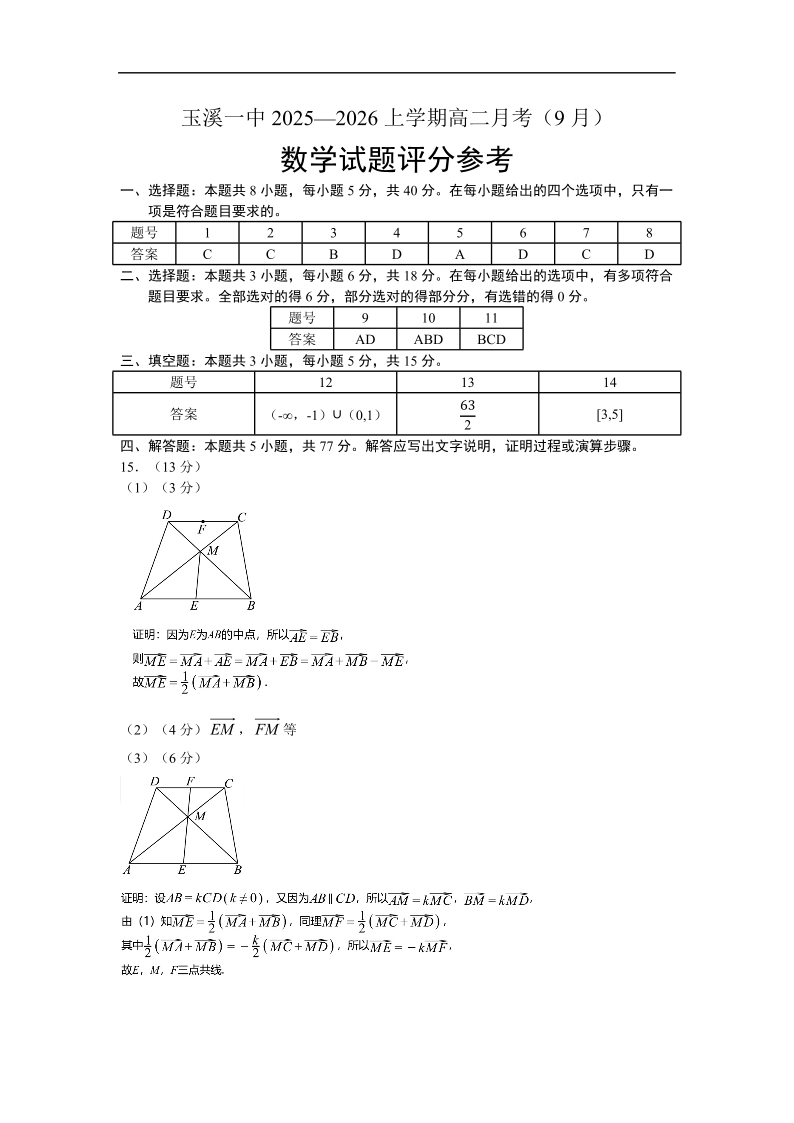 高二数学答案--云南省玉溪市红塔区玉溪第一中学2025-2026学年高二上学期9月月考
