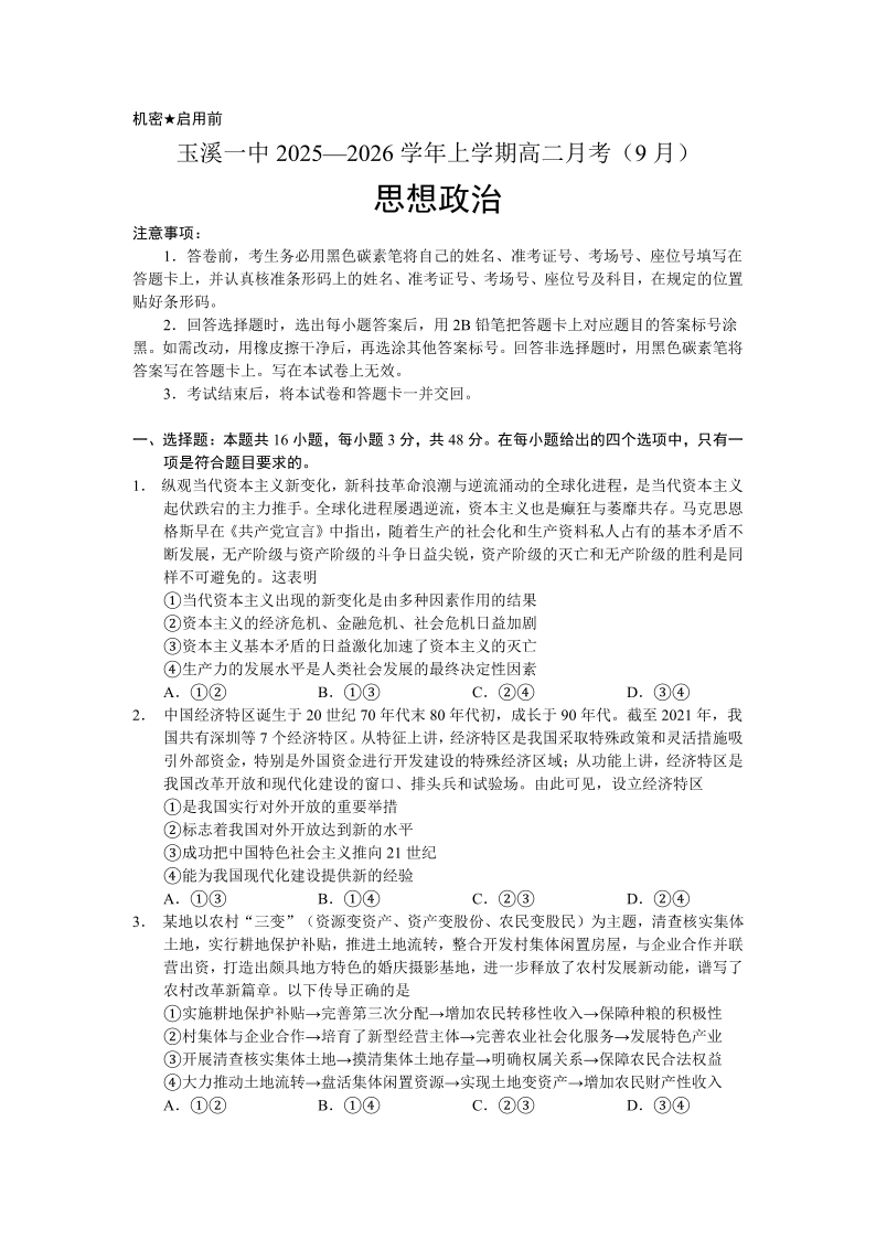 高二政治--云南省玉溪市红塔区玉溪第一中学2025-2026学年高二上学期9月月考