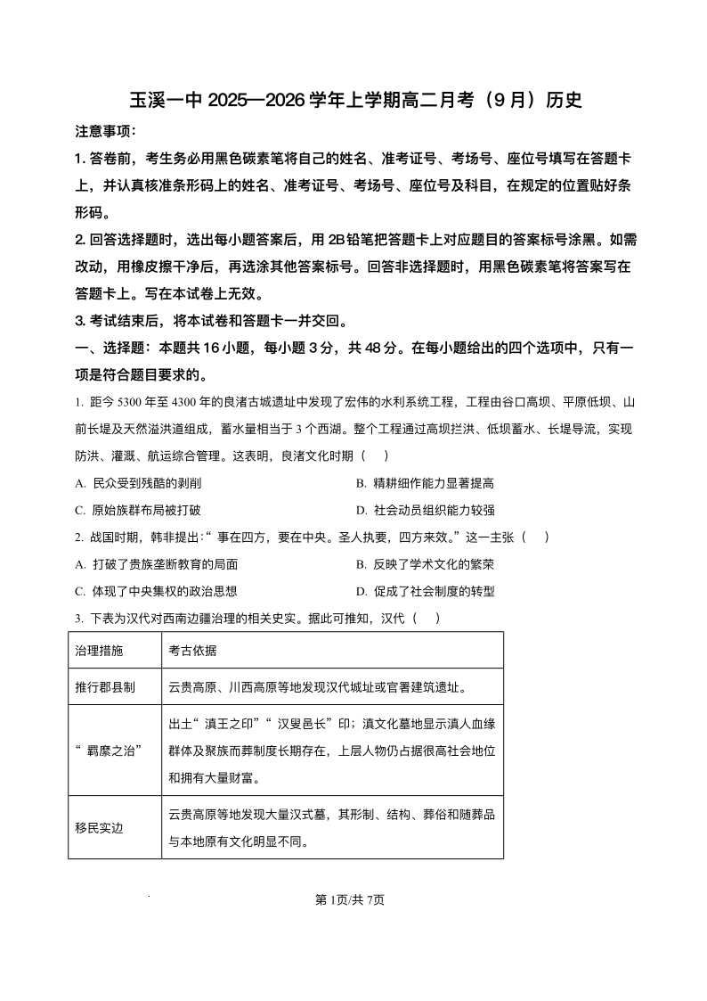 高二历史+答案--云南省玉溪市红塔区玉溪第一中学2025-2026学年高二上学期9月月考