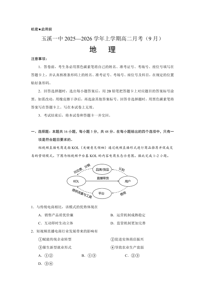 高二地理--云南省玉溪市红塔区玉溪第一中学2025-2026学年高二上学期9月月考