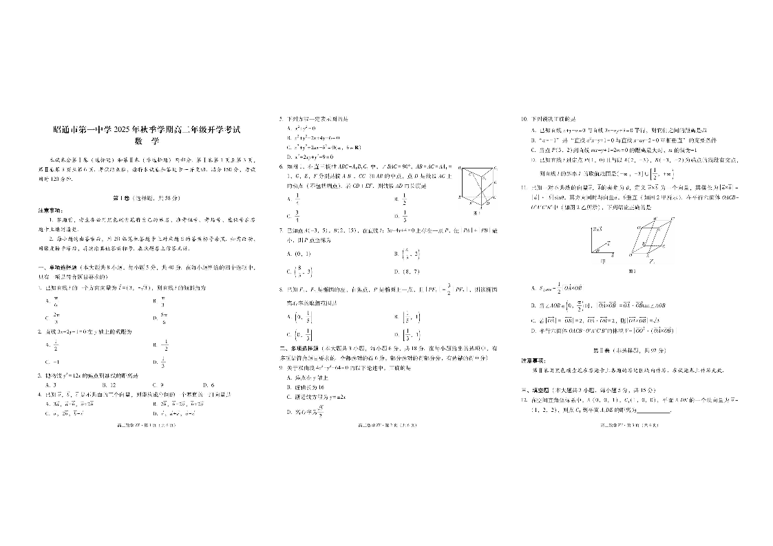 高二数学+答案--云南省昭通市第一中学2025-2026学年高二上学期开学检测