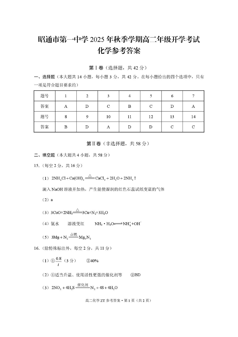 高二化学答案--云南省昭通市第一中学2025-2026学年高二上学期开学检测