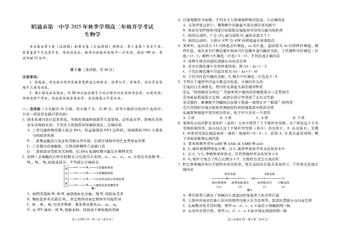 高二生物+答案--云南省昭通市第一中学2025-2026学年高二上学期开学检测