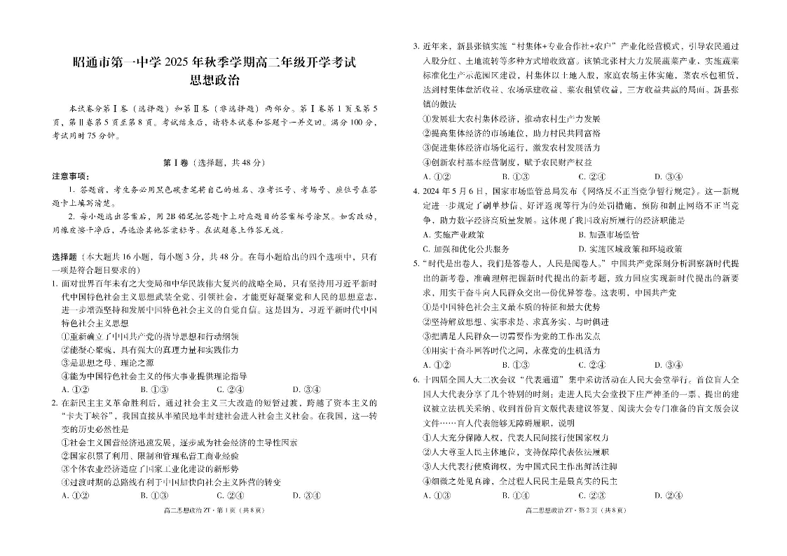 高二政治+答案--云南省昭通市第一中学2025-2026学年高二上学期开学检测