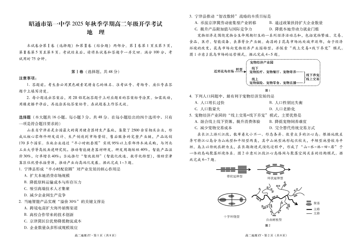 高二地理--云南省昭通市第一中学2025-2026学年高二上学期开学检测