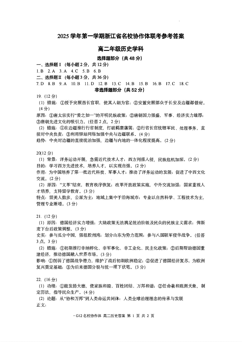 高二历史答案--浙江名校协作体2025-2026学年高二上学期开学联考