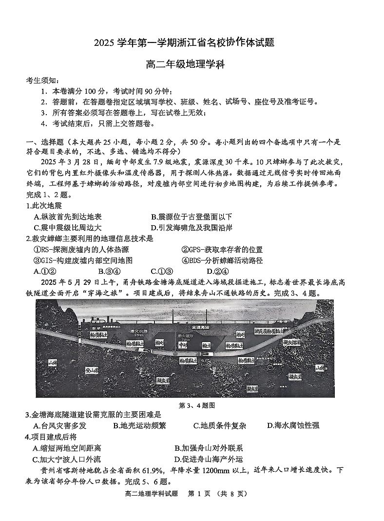 高二地理--浙江名校协作体2025-2026学年高二上学期开学联考