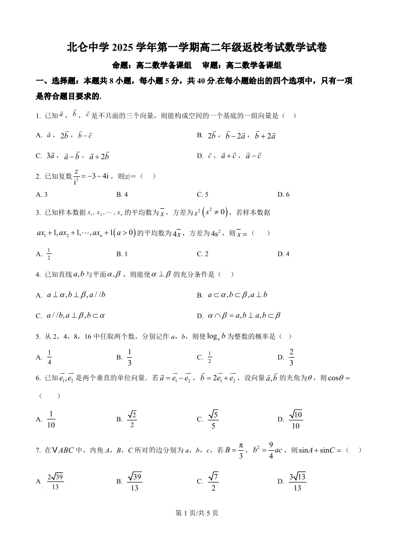 高二数学(原卷版)--浙江省宁波市北仑中学2025-2026学年高二上学期返校考试